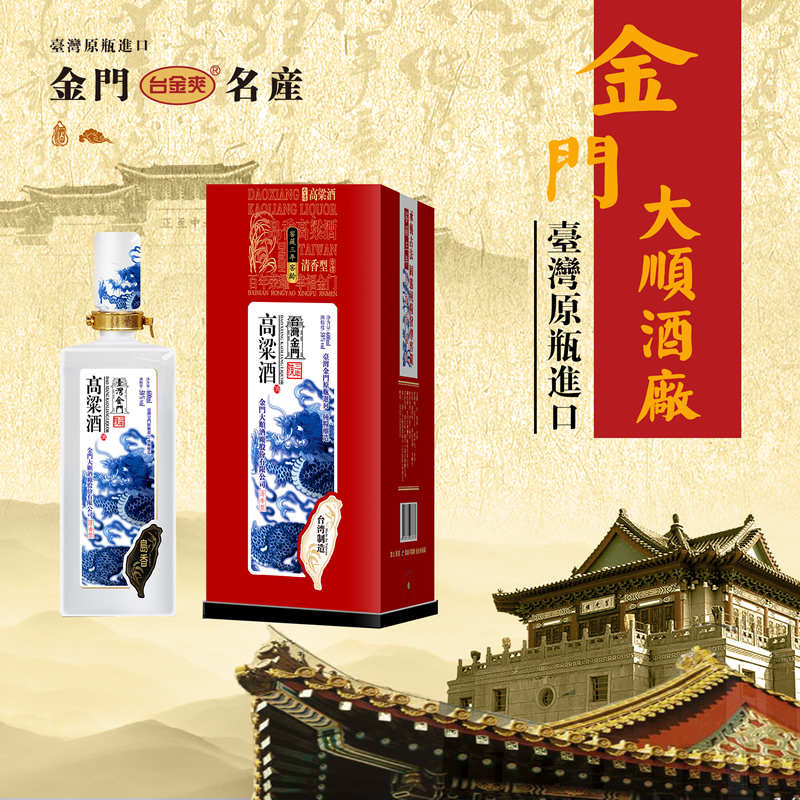 金門大順酒廠,座落于金門北緯24.5度,地處海隅,濱大陸,得天獨(dú)厚的地理,使它擁有絕佳的水質(zhì)、空氣、氣候及原料的四大天然釀酒條件。金門大順酒廠的高粱酒釀造是利用金門特產(chǎn)『旱地高粱』、引用當(dāng)?shù)厮|(zhì)甘甜的泉水、金門潔凈的空氣與氣候條件,并承襲傳統(tǒng)古法之釀酒技術(shù),加上獨(dú)家的釀酒專業(yè)技術(shù)經(jīng)驗(yàn)【三離二鍋一翻】的發(fā)酵釀酒工藝,經(jīng)掐頭去尾后入庫(kù),去蕪存菁。而造就出金門大順酒廠的高粱酒特色「清澈透明、質(zhì)地純凈、芳香濃郁」之一系列高粱酒。金門大順酒廠制酒承襲著金門得天獨(dú)厚的地理環(huán)境,加上三代流傳之古法醇釀技技術(shù),結(jié)合經(jīng)驗(yàn)與現(xiàn)代化生產(chǎn),釀出風(fēng)味獨(dú)特,香、醇、甘、冽的【臺(tái)島】【臺(tái)金爽】【牛樟芝高粱酒】【龍騰鳳舞】【紅雙十】【陳高吶】【臺(tái)灣小酒】等多樣系列產(chǎn)品。真實(shí)原味、清香散發(fā),甘冽醇厚的絕佳風(fēng)味。